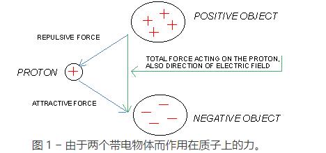 当观察到电子排斥其他电子但吸引质子时,“电场”的概念就出现了。这种吸引-排斥实际上在电子或质子发现之前就已经存在了。早期的测量研究了物体在用布或毛皮摩擦后碰巧获得过量或缺乏电子的力。如果两个电子相距一厘米,每个电子将受到 2.3 x 10 -24 克当量的排斥力。将分离距离加倍会将力减少到四分之一。将一侧的电子数量加倍将使作用在另一侧的孤立电子上的排斥力加倍。大多数物质是中性的,因此它含有相同数量的质子和电子。然而,有时电子会被有意或无意地从一个物体上移走,并沉积到另一个物体上。如果质子(或其他带正电的物体)放置在这两个带电物体附近,质子将被具有多余电子的负物体吸引,同时被缺少一些电子的正物体排斥。作用在质子上的总力是质子所暴露的电场的量度。作用在质子上的力的方向与电场的方向相同,力的强度与电场的强度成正比。(作用在质子上的力,以克当量为单位,乘以 6 x 10 16,得到以伏每米或 V/m 为单位的电场。)如果用电子代替质子,则力将为电场强度相同但方向相反。如果用两个“绑”在一起的质子代替单个质子,它们将受到两倍的总力。(图。1)