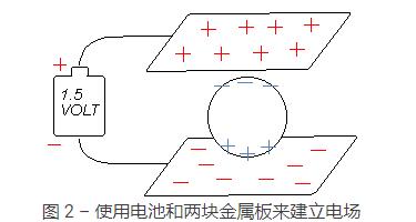 如果电池的端子连接到两个大金属板(图2),+板将失去一些电子,这些电子将通过电池流向-板。