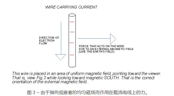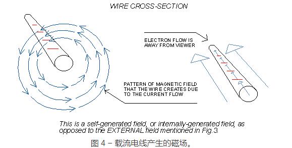 除了受到磁场的影响外,承载电流的电线还会产生磁场(但是,由于电线自身产生的磁场,电线不会受到任何总力)。如果电线很长,则场强在距离电线一半的距离处增加一倍,在四分之一距离处场强增加四倍。场的方向如图4所示。