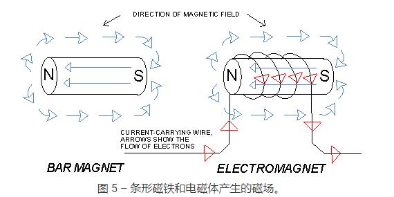 载有 1 安培电流的电线在一厘米远的地方会产生 0.00002 特斯拉或 200 毫高斯 (mG) 的磁场。两厘米处,视野将是一半。承载电流的线圈以及条形磁铁会产生图 5 所示的经典磁场模式。(条形磁铁由需要电流“帮助”来实现和维持磁化的材料制成。)